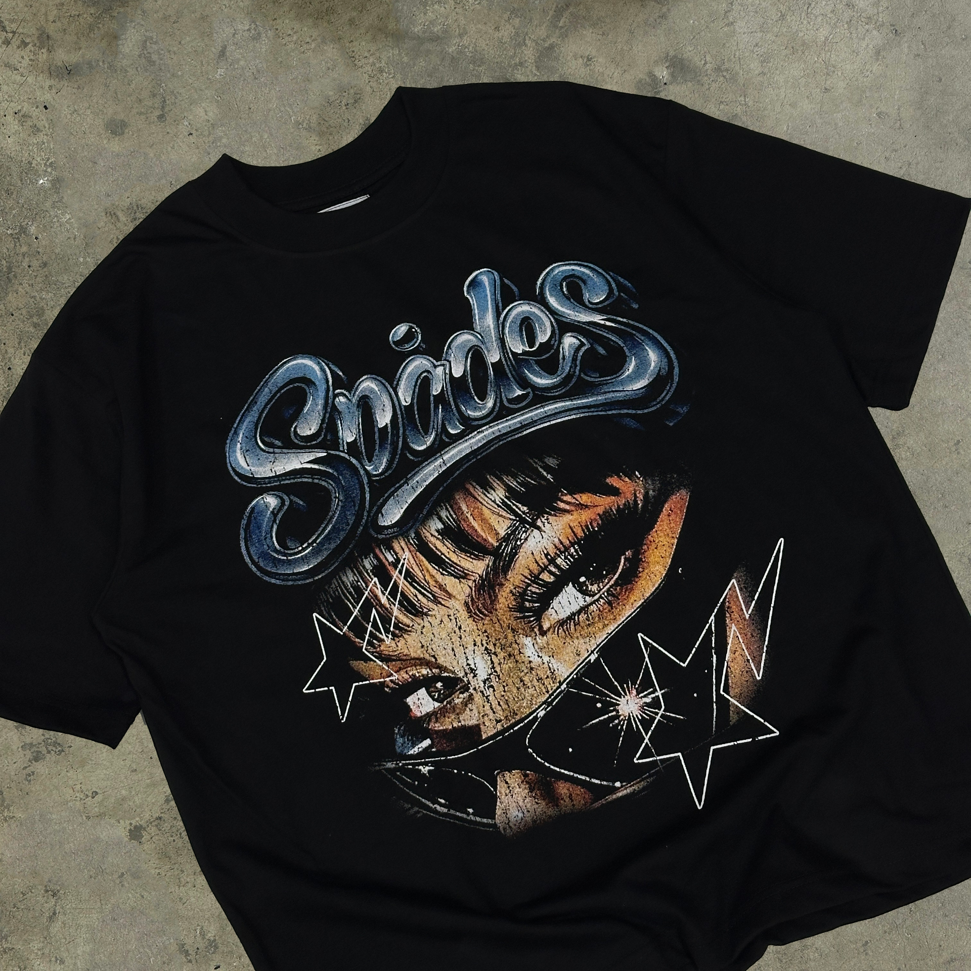 Capture the magic of the night sky with the Starry Gaze tee. This black shirt features an enigmatic eye design adorned with sparkling stars and elegant "Spades" lettering, offering a mystical and stylish look that turns heads. Perfect for those enchanted by celestial vibes, it’s a versatile piece for any wardrobe.